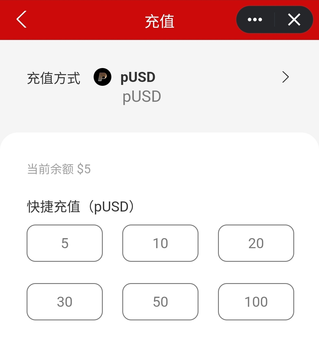 选择您希望充入的金额就可以了,我们接受的充值方式是pUSD,但是我们接入了MixPay,您可以用任何您想使用的币种进行充值。