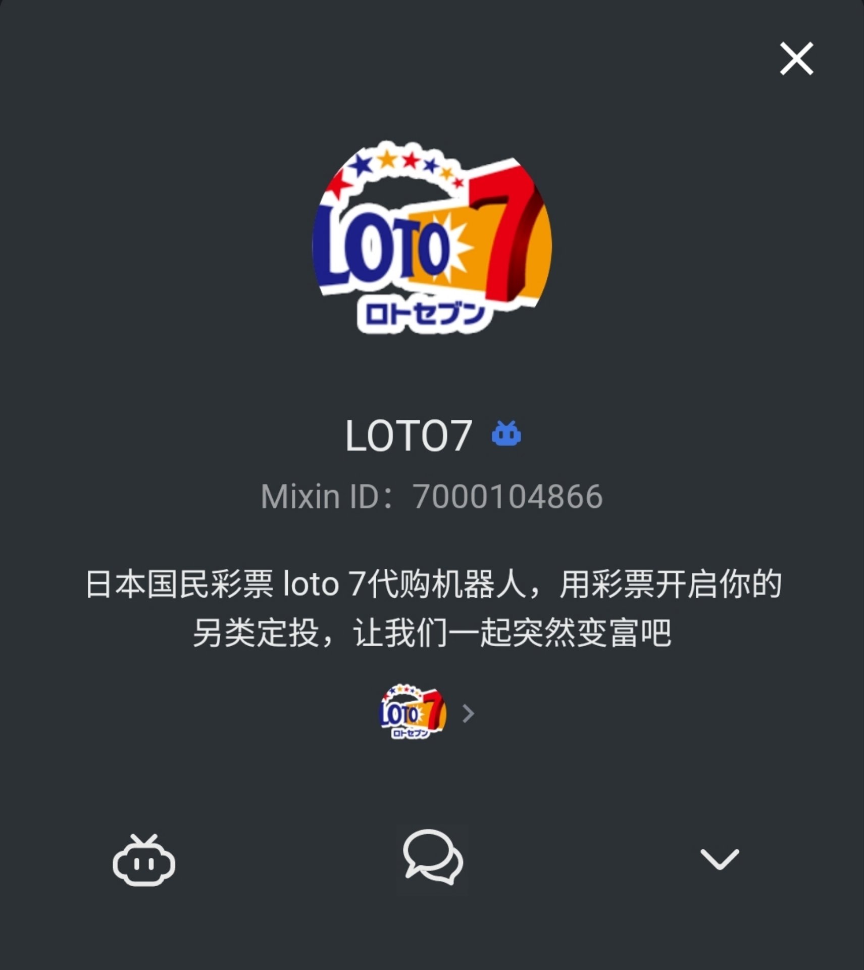 首先,您需要在Mixin Messenger内搜索LOTO7的机器人(ID:@7000104866)