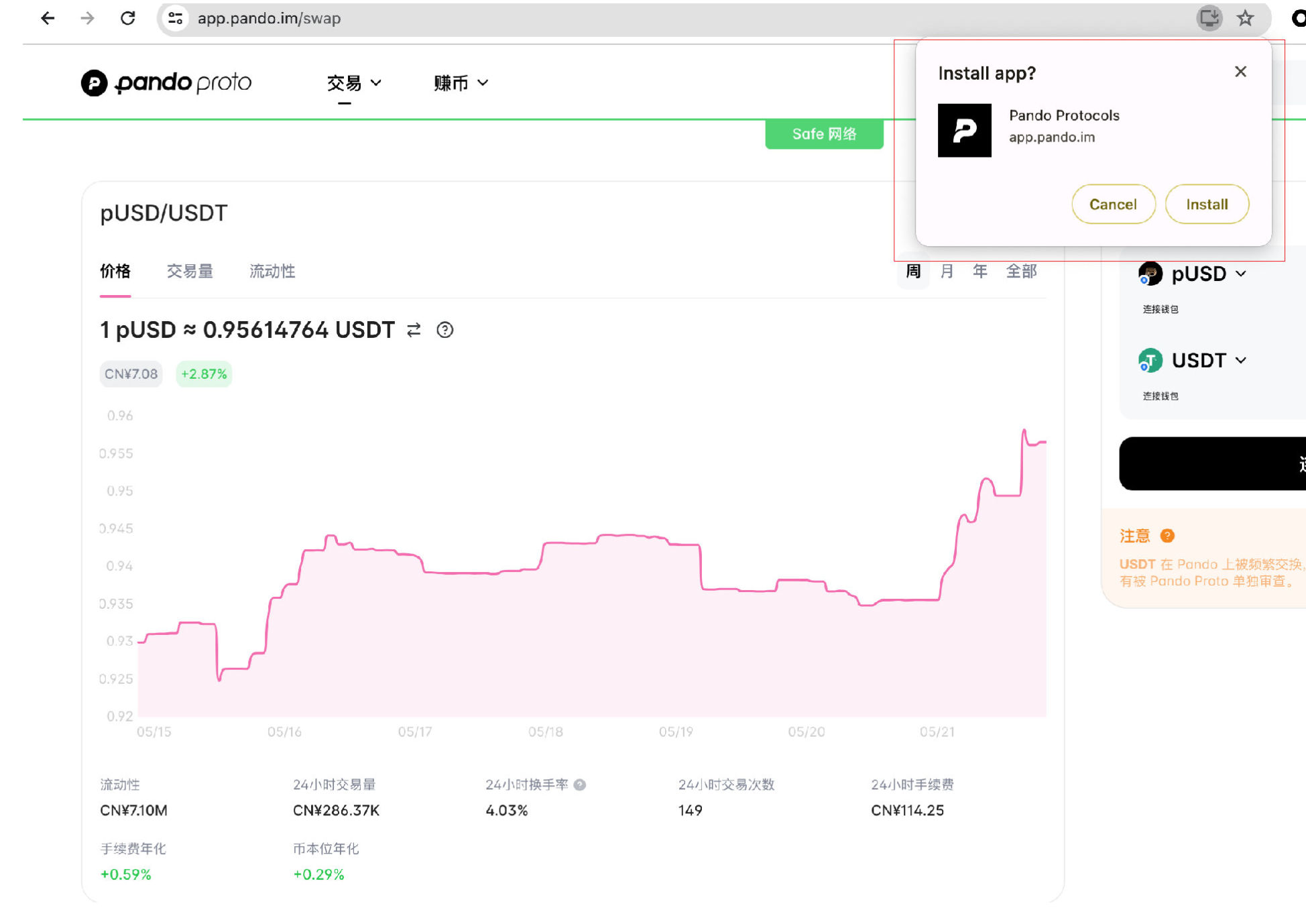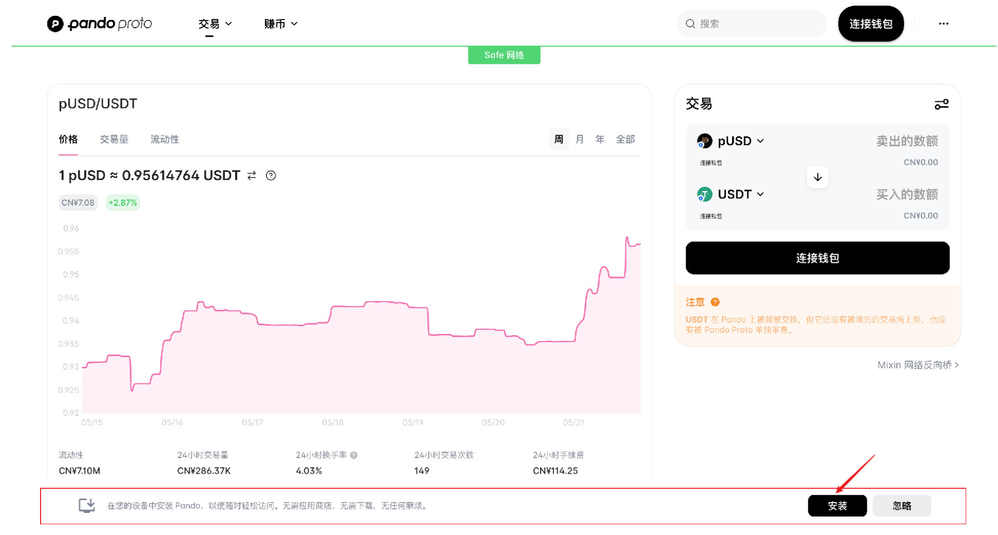 首先,在浏览器地址栏中输入 Pando 官网地址 https://app.pando.im,进入页面后会在页面底部看到在设备中安装 Pando 的提示。