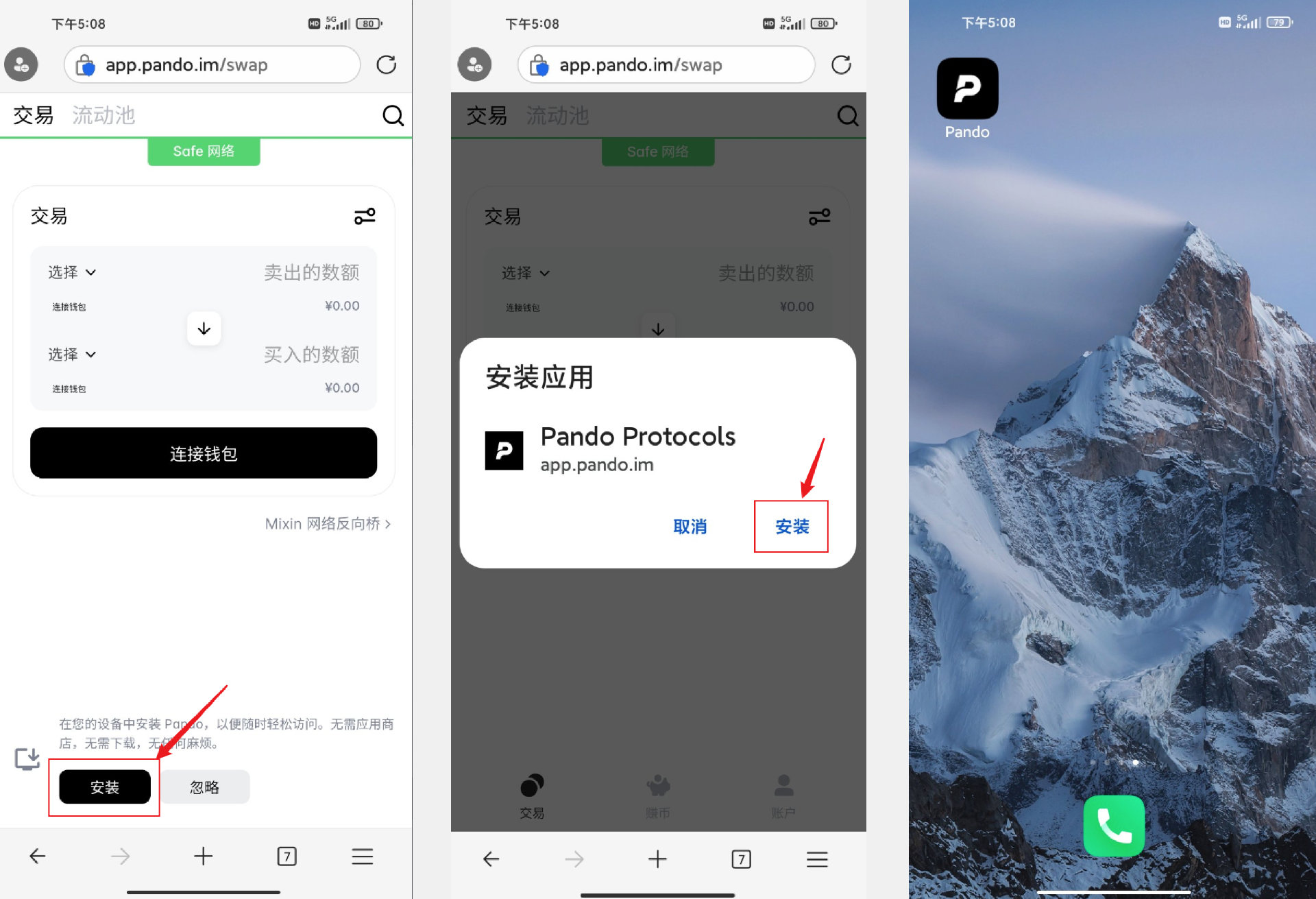 在浏览器地址栏里输入 Pando 官网地址 https://app.pando.im,点击页面底部的 Pando PwA 安装提示。在安装确认弹窗点击“安装”后,稍等一会儿,Pando 就安装到手机主屏幕了。在 app 列表中搜索 “Pando”,即可以找到 Pando PwA 入口。点击进入后,就可以像使用 app 一样使用 Pando 了。