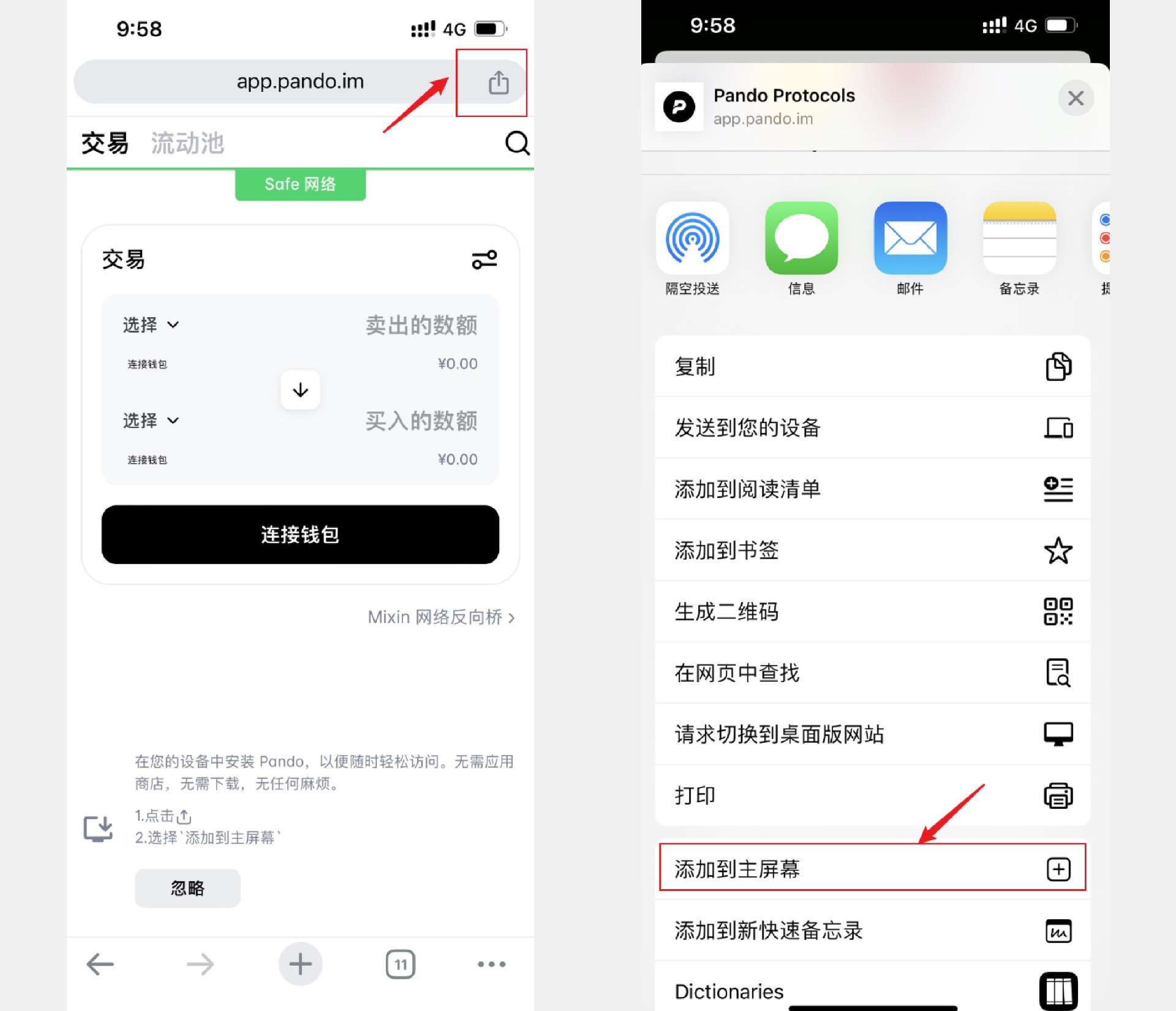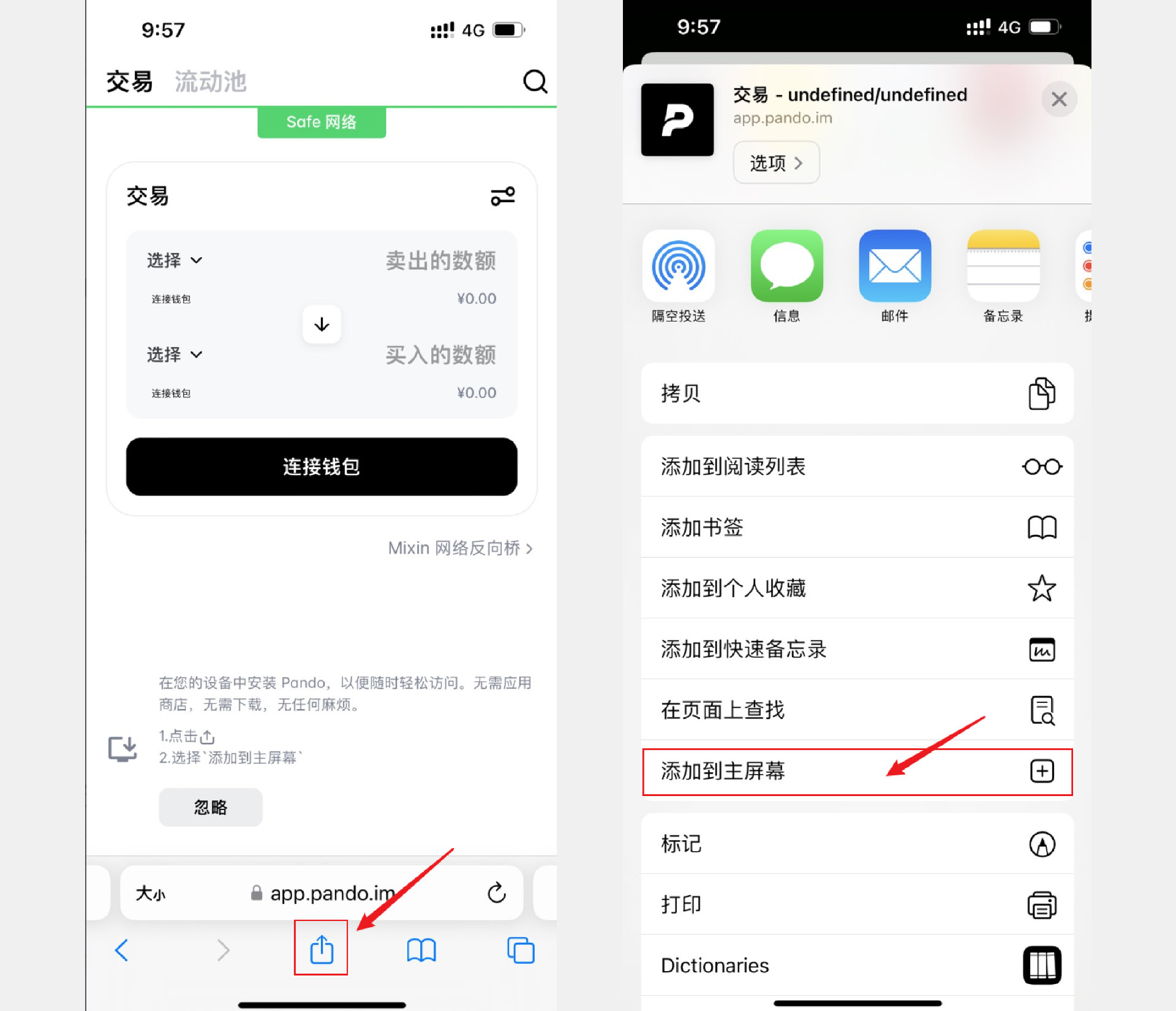 在手机的 Safari 浏览器地址栏里输入 Pando 官网地址 https://app.pando.im,点击屏幕最下方中间的按钮,在弹出的列表选择“添加到主屏幕”。