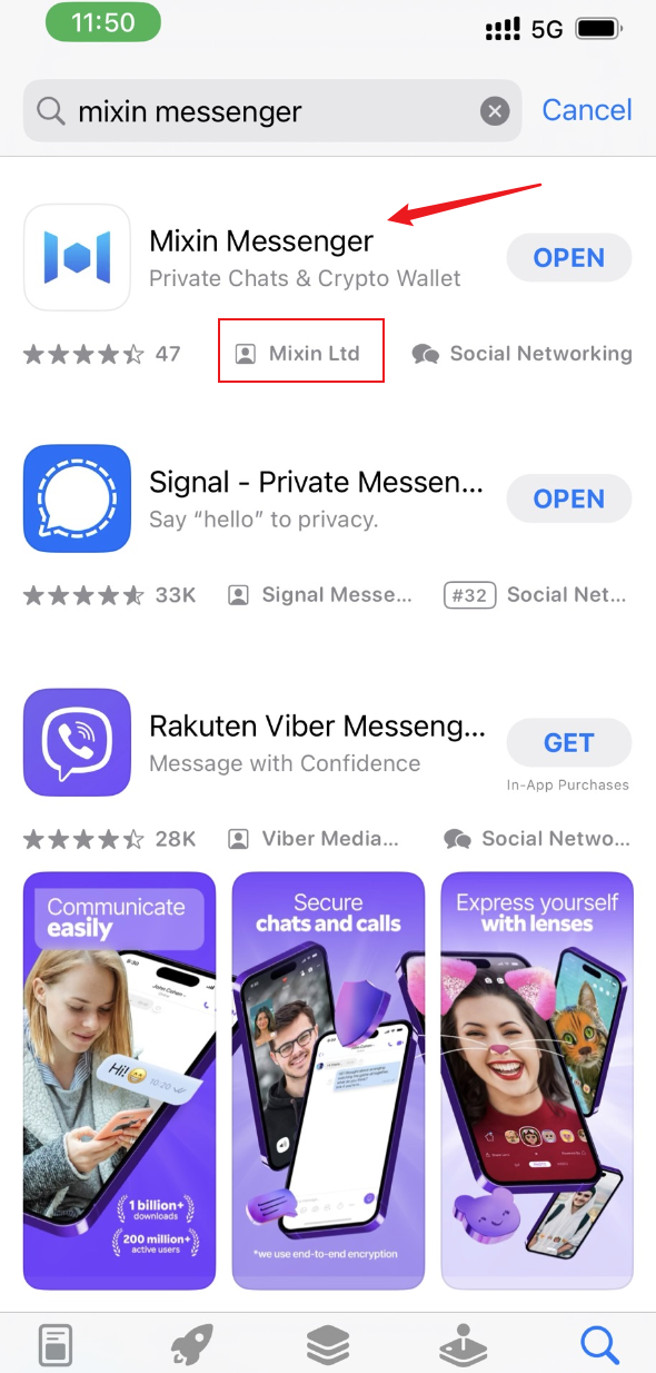 第四步:此时您已经登录对应的非中国大陆区 Apple ID,在搜索页搜索 「Mixin Messenger」下载就可以使用了。