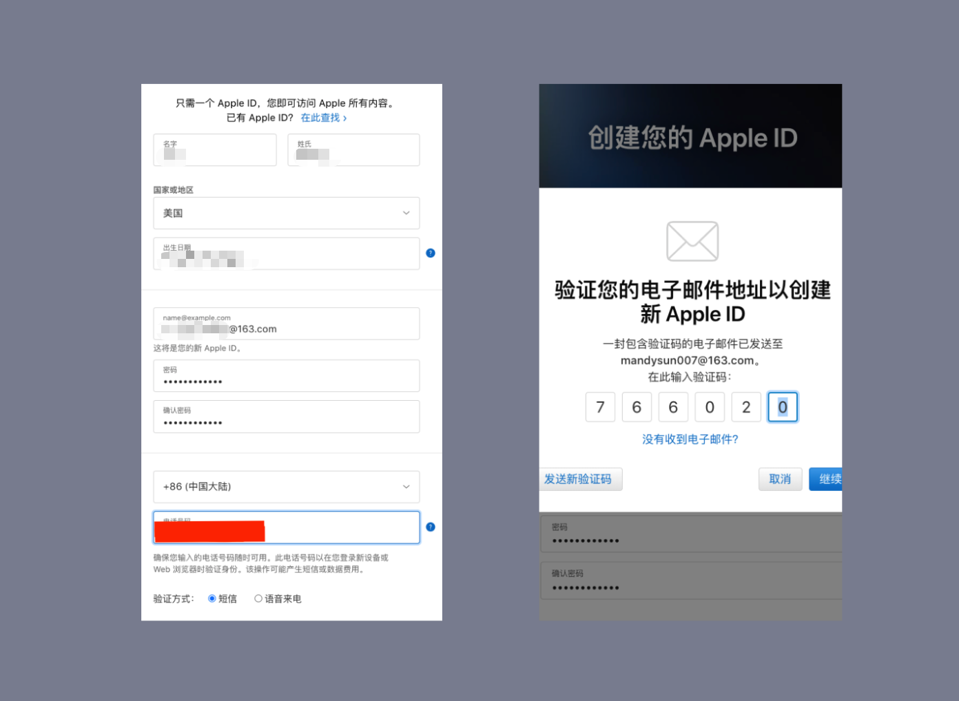 完成之后,Apple 会根据你填的邮箱和手机,发送验证码。之后你只需要在对应的框里输入对应的验证码。(手机号可以填写大陆区手机号)