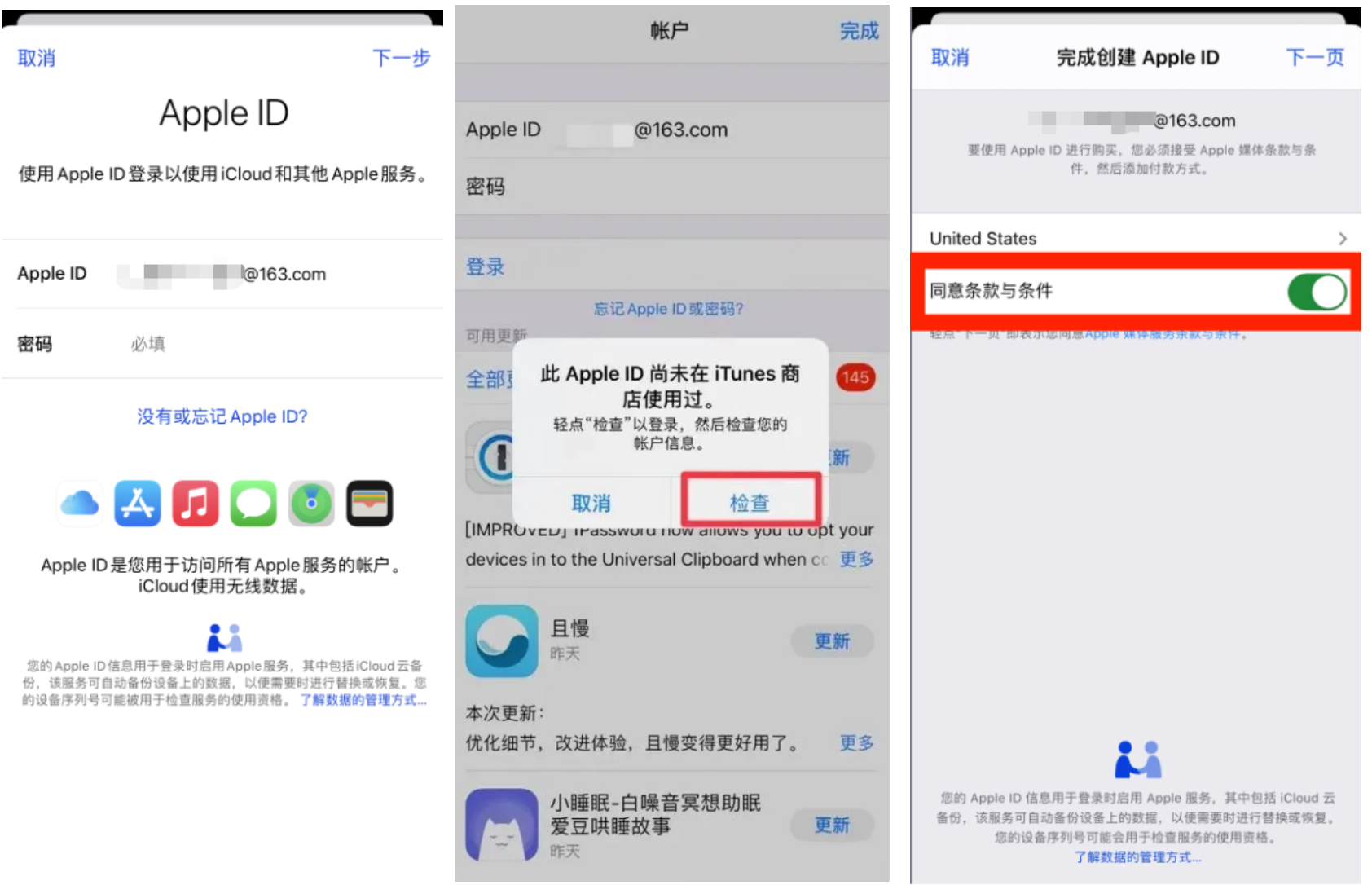 因为是新 Apple ID 第一次登录,所以会有「检查」的提示,点击「检查」。接着,请点击「同意条款与权限」,就可以成功开始使用了!