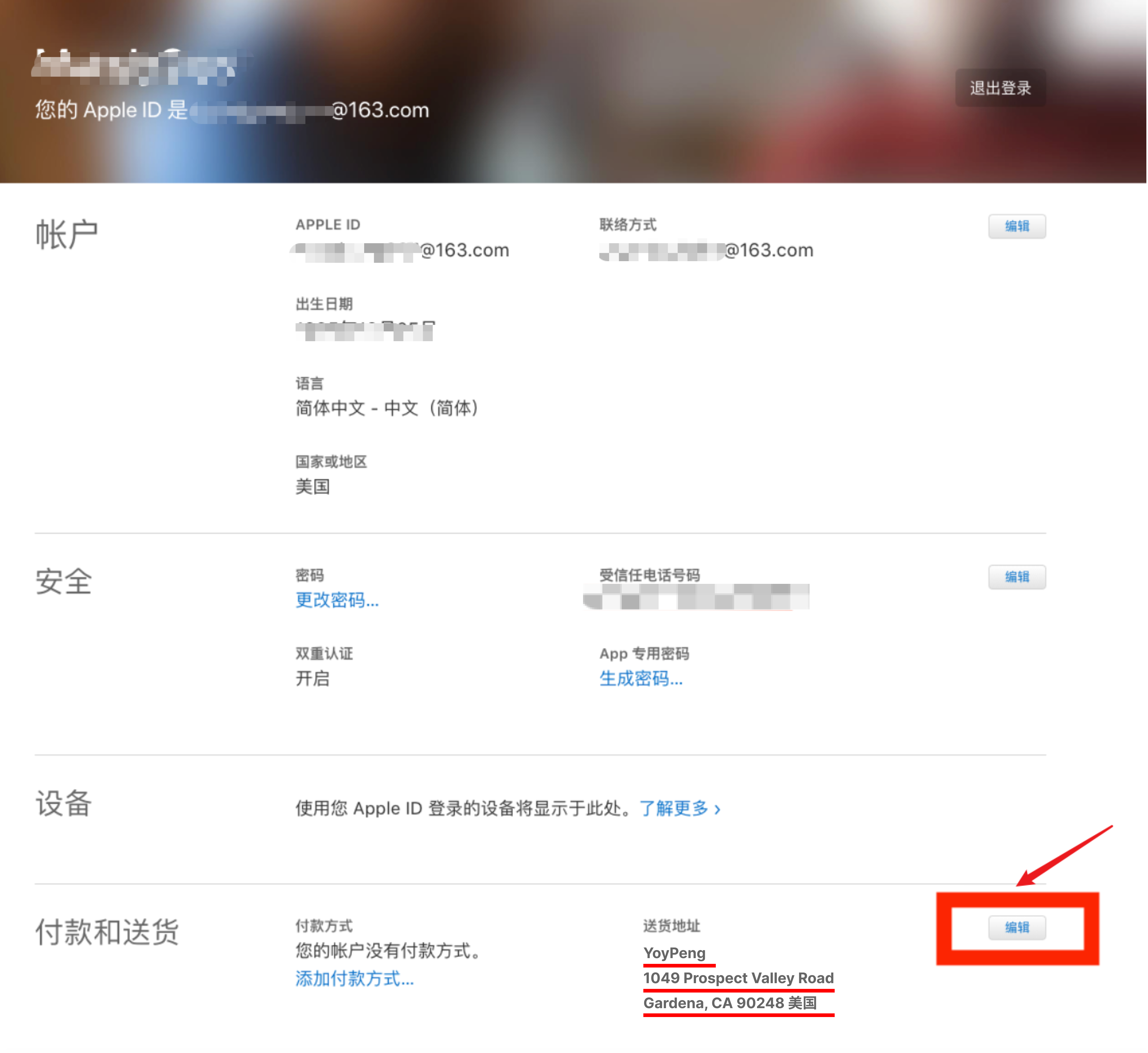 第二步:验证通过后,您就进入您的 Apple ID 页面了。点击「付款和送货」的「编辑」,并按照要求,填写有效的美国地址和电话号码。