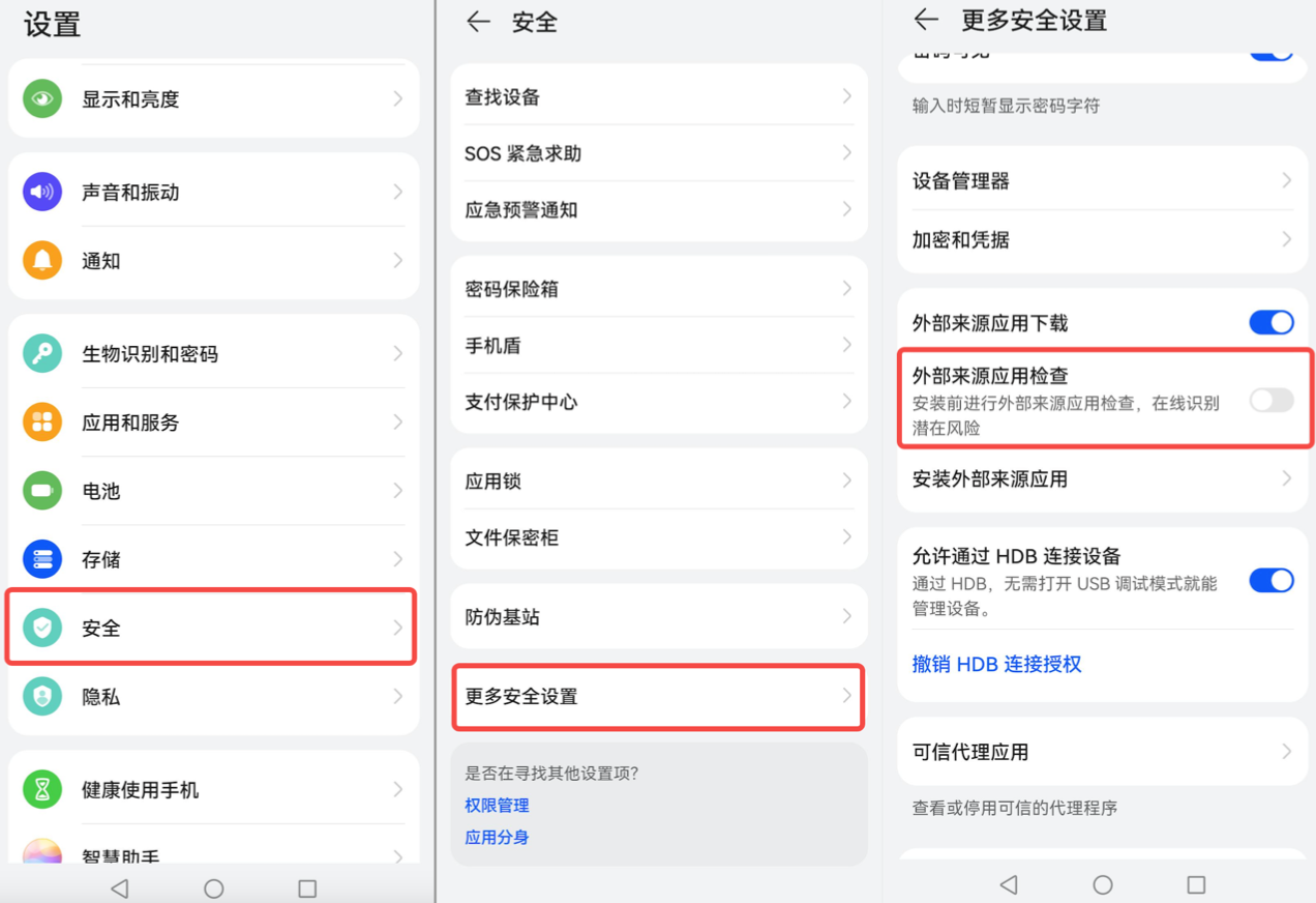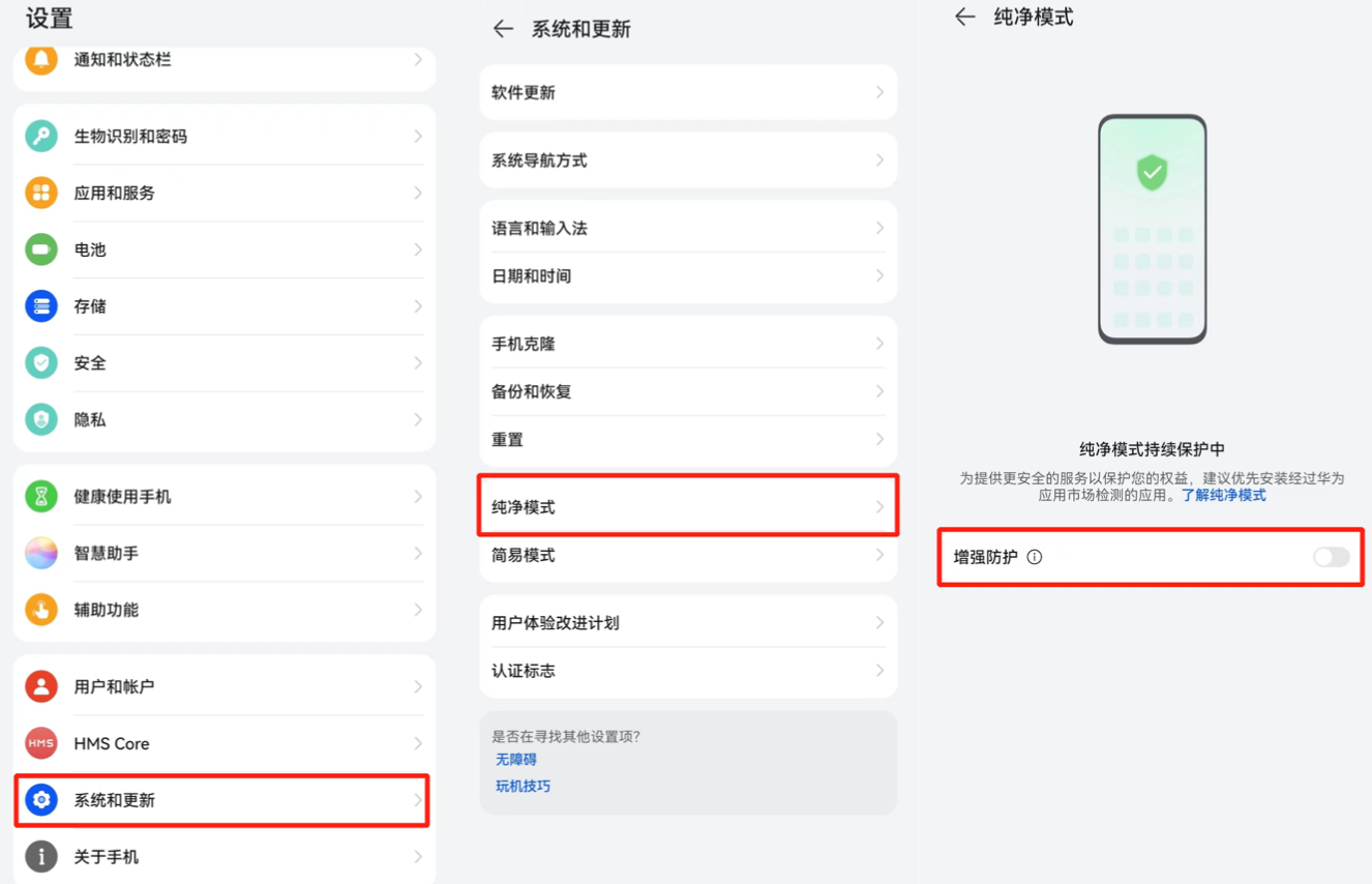 在手机主页—「设置」—「系统和更新」—「纯净模式」下,关闭「增强防护」,并且在「设置」—「安全」—「更多安全设置」下打开「外部来源应用下载」以及关闭「外部来源应用检查」。