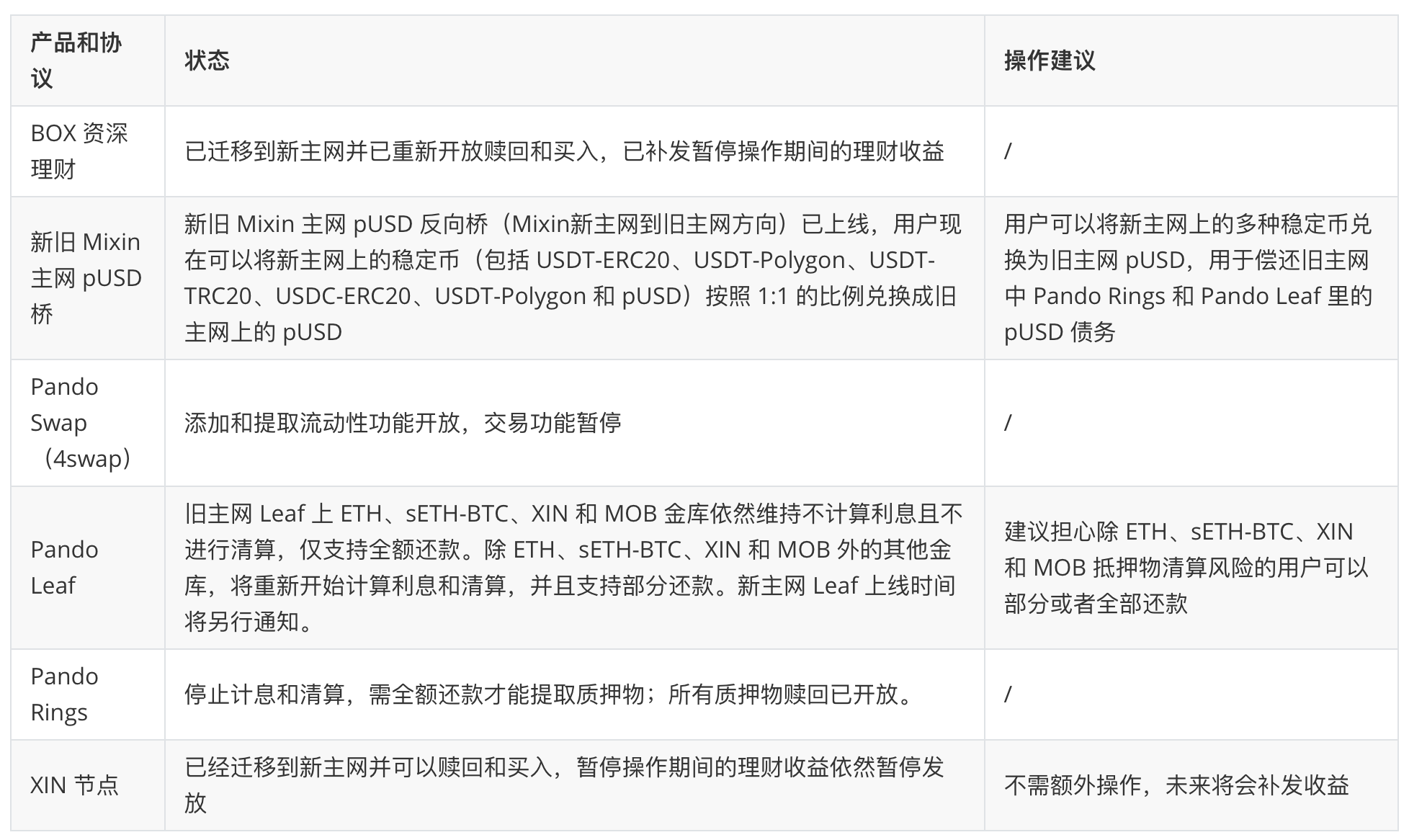 随着 Mixin 新系统上线,Pando 各协议的功能在逐步恢复中。本文将Pando 各协议和产品目前运行状态以及近期与使用相关的常见问题(FAQ)做一个汇总。