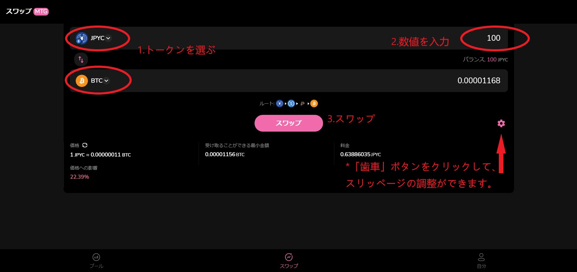 トークンを選び、数量を入力します。入力したら、価格や価格の影響などの情報が表示されます。(流動性が低いので、今回はJPYC/BTCとスワップしません。)↓