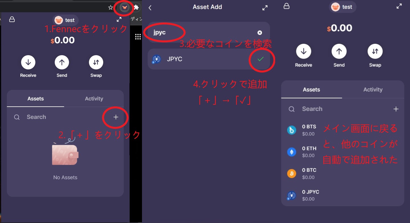 ブラウザで【Fennec】のアイコンをクリックし、【Fennec】を開きます。新しく作ったアカウントにはトークンが表示されないことがあるので、必要なトークンを追加しましょう。↓