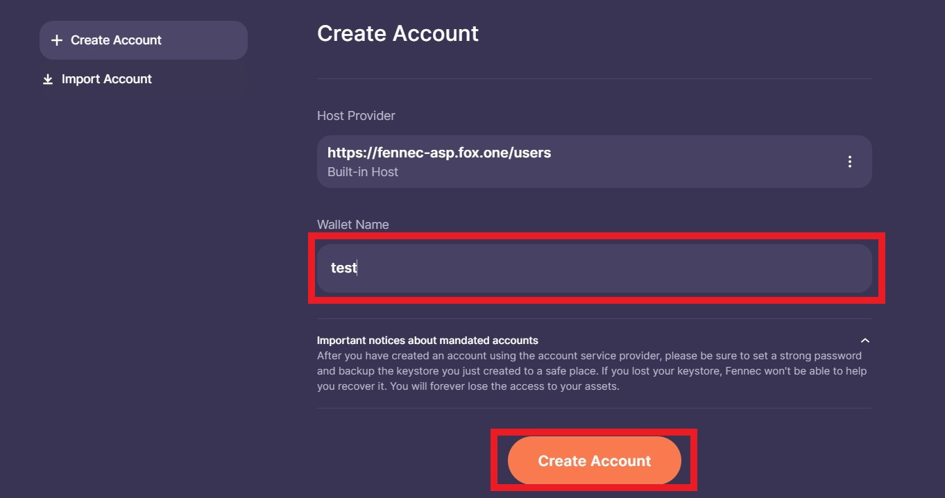 「Host Provider」はそのままにして、ウォレット名を入力し、「Create Account」をクリックします。↓