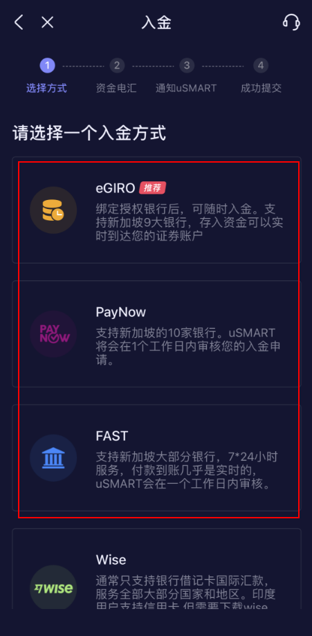 注意:除了eGIRO入账,入账完后,需要点击“已转账,通知USMART”如实填写金额,到账大于1-2个工作日。