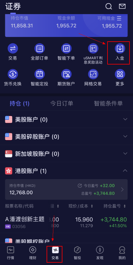 打开uSMART APP,点击交易,再点击更多