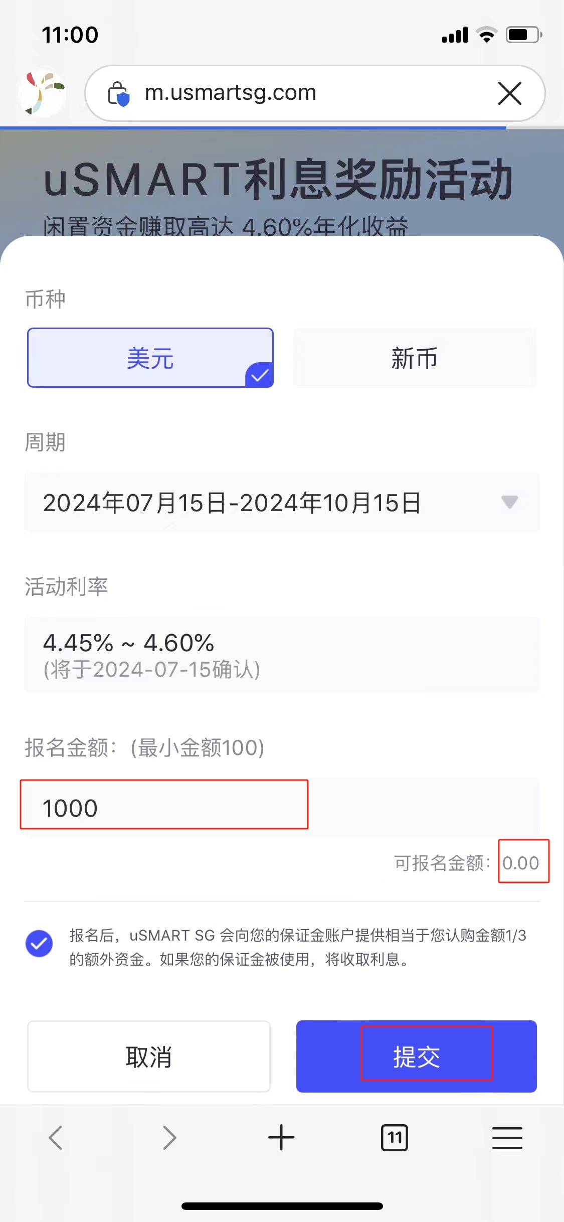如果可报名金额为0,需要再uSMART APP兑换为美元。