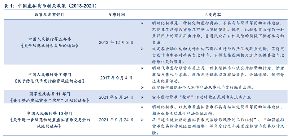 国内于2013年、2017年及2021年发布加密货币有关监管政策共计4次。核心内容总结如下: