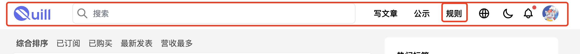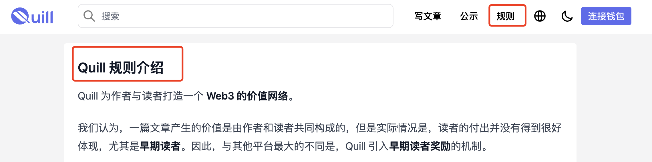 这里我用电脑端进行演示。通过阅读规则,我们知道了Quill是什么,它和传统的写作平台有非常多不一样的地方,其中最大的不同是不光作者有收益,并且连读者也是有收益的。