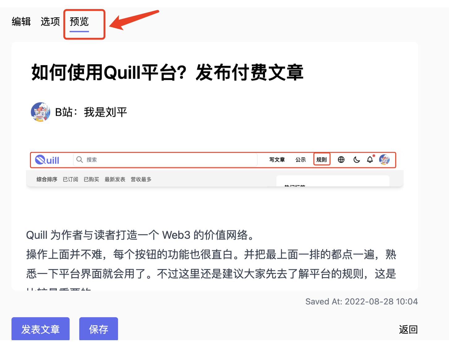 检查: 点击 预览 ,这样就是切换到文章发表时的效果,也就是别人最终看你文章的样子。通读一遍,检查是否有要修改的地方,比如:插入的图片是否显示正确?