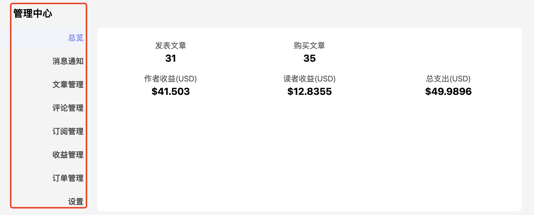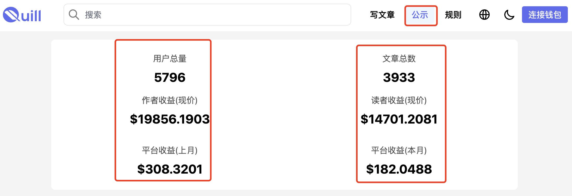 公示中会显示平台的用户总量、文章总数、作者收益(现价)、读者收益、平台收益等。