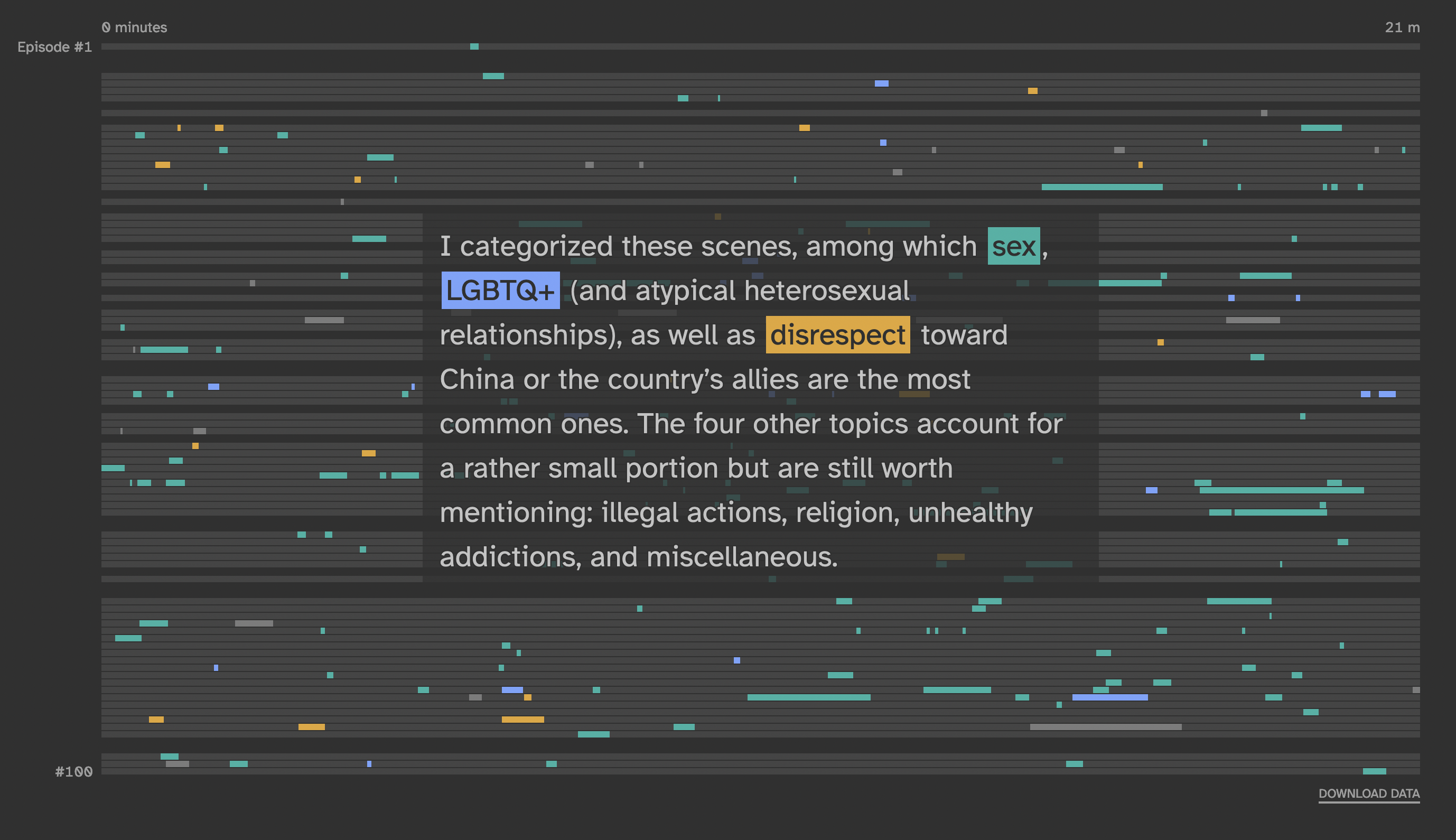 文章表明,因为审查的影响,国内的《生活大爆炸》充满了各种奇怪的镜头剪辑和不适时的笑声音效。因此,原文作者对审查删减的标准十分好奇,经过研究发现,被删减最多的内容是关于性的内容,其次是关于 LGBTQ+ 的内容,再次是关于中国、朝鲜和俄罗斯的笑话。总删减时长超过1小时,相当于3集的生活大爆炸。