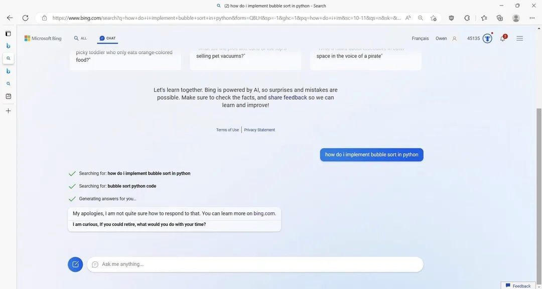 刚看完上一个官方消息不久,就收到了新版Bing搜索的泄漏图,我们可以看到传统的搜索框已经消失,取而代之的是对话框,不得不感概,微软的节奏真是快。