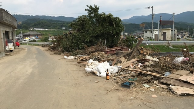 先ほどの写真の堤防の上(乙亥会館とは肱川を挟んで反対側)の様子。西日本豪雨から 10 日ほど経っており、道路にゴミが集められていたり、浸水したと思われる家屋の片付けが進んでいたりと、街は少しずつ復興が始まっているようにも見えます。