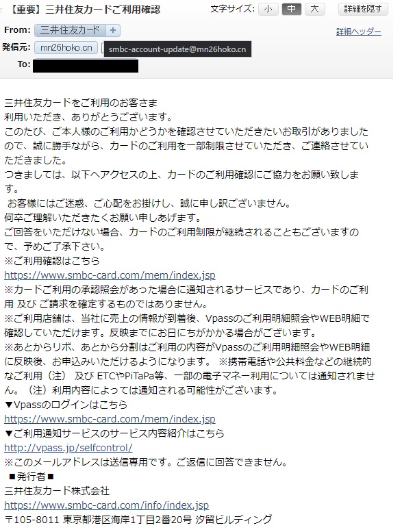 クレジットカード会社や銀行、ショッピングサイト等の実在する企業を装った電子メールを送り、