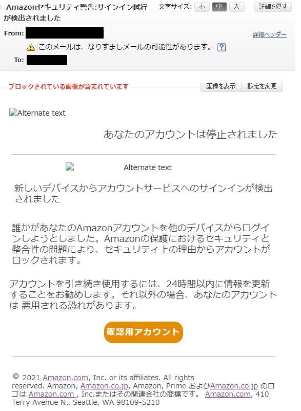 ショートメッセージ (SMS) から誘導されるフィッシングについては、Amazon をかたる文面のものが多く報告されています。