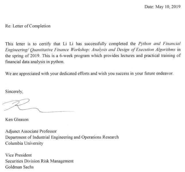 2019年5月,李力参加了高盛风险管理部副总裁Ken Gleason的Python和金融工程工作坊,学会了使用机器学习算法进行数据分析和建模,学会了使用VWAP(成交量加权平均价格)交易算法,减少交易的冲击。