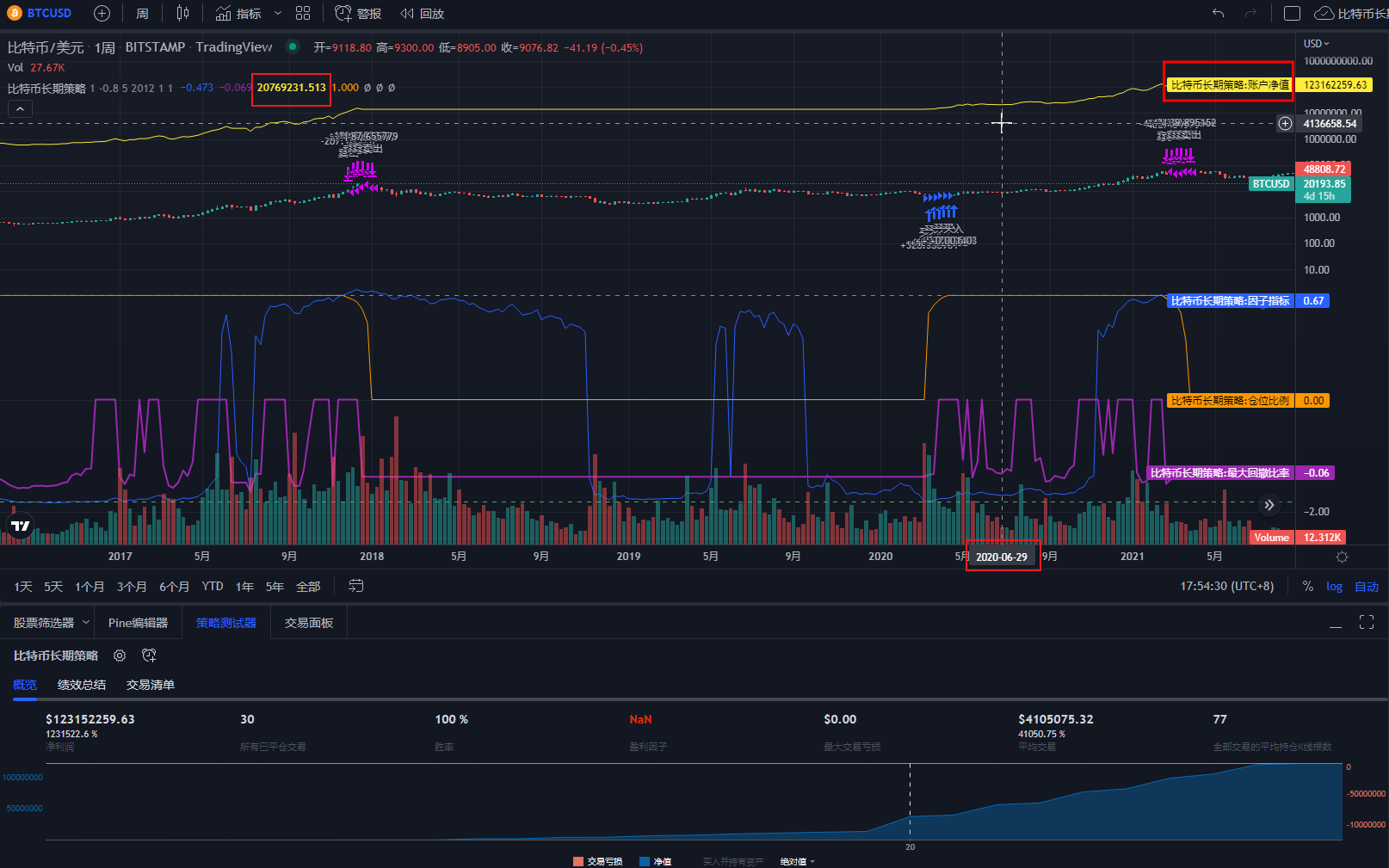 2020年6月,李力研究出了预测比特币市值对数的模型,准备率高达90%,设计出了预警指标,根据预警指标的历史数据建立了比特币长期投资策略,利用2012年1月-2020年6月历史数据作回测,累计收益率2077倍,最大回撤比例25%。刚开始李力对这个策略还没有很大的信心,因为交易次数太少了,会不会样本不足?