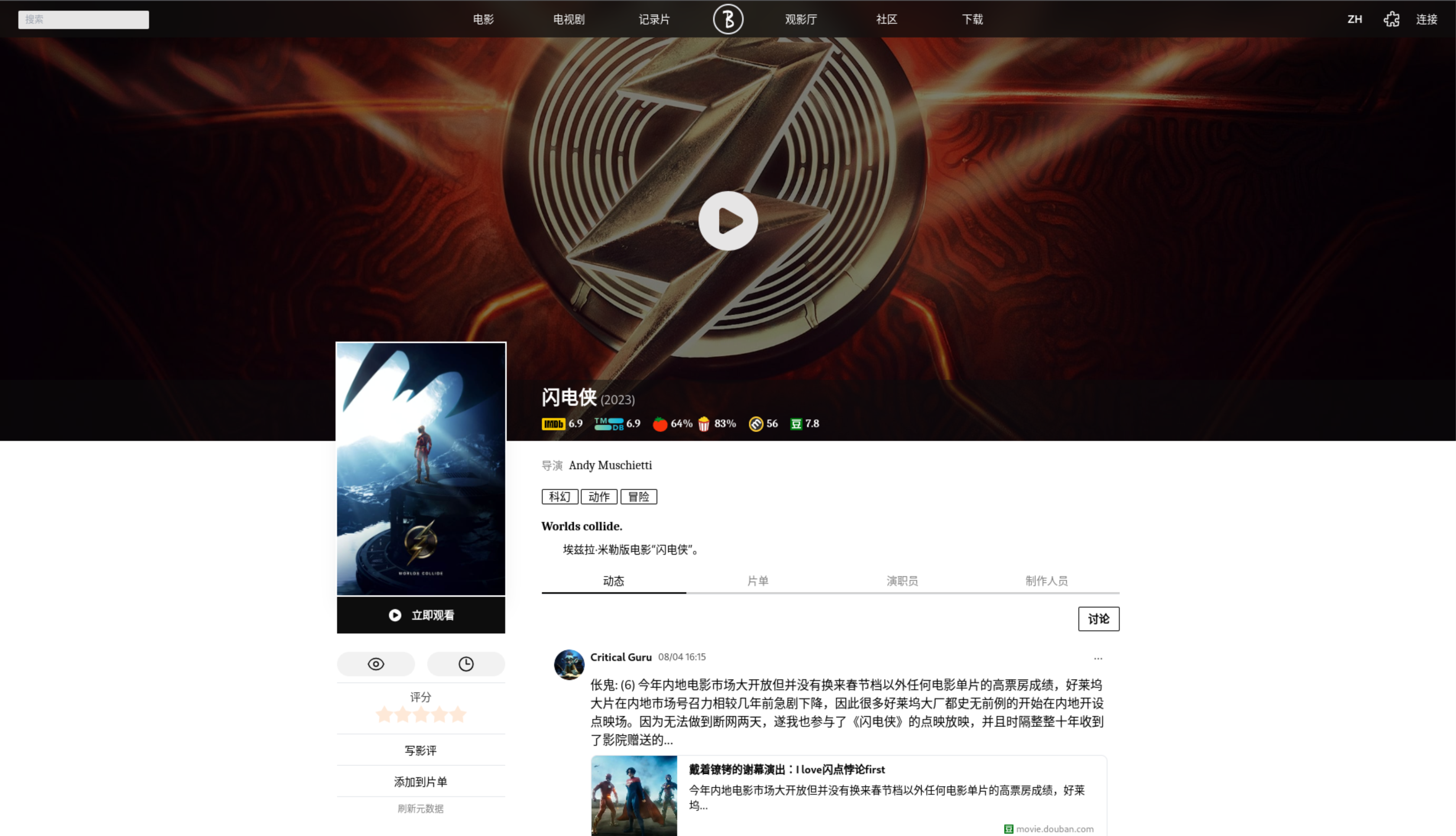 下面以近期比较热门的电影 闪电侠 为例,打开网页,即可看到该电影的基本信息,包括来自主流影评网站的评分,例如 豆瓣、IMDB、烂番茄和 Metacritic 等。