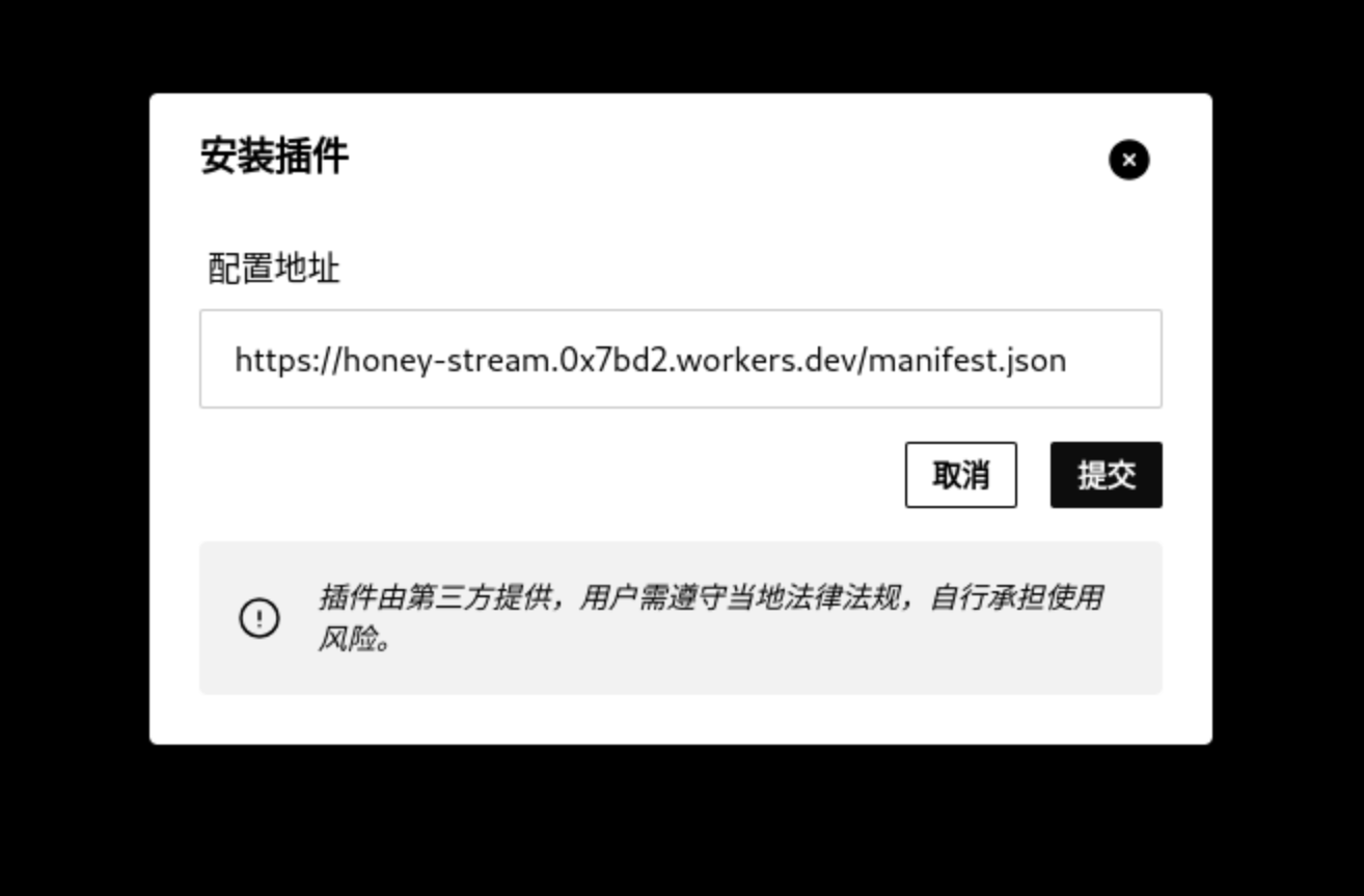 在这里强烈推荐一个插件: HoneyStream。 安装方法非常简单,在 配置地址 栏输入插件的配置网址即可,对于 HoneyStream 即