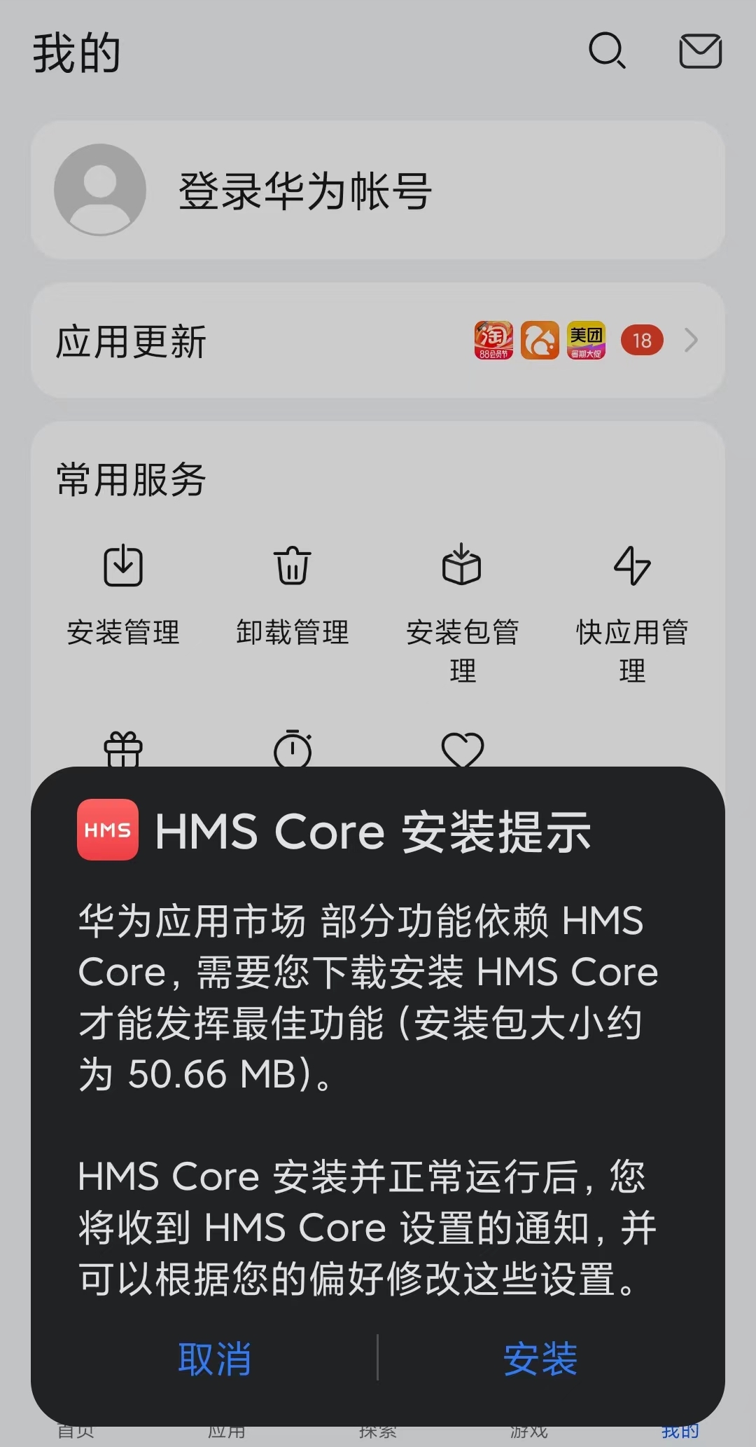 登录账号前需要安装华为的HMS CORE,否则会提示你安装HMS CORE,当你点确定安装,系统会跳转到系统自带的应用商店,导致下载失败。解决办法:直接在华为商店里搜索HMS CORE安装。